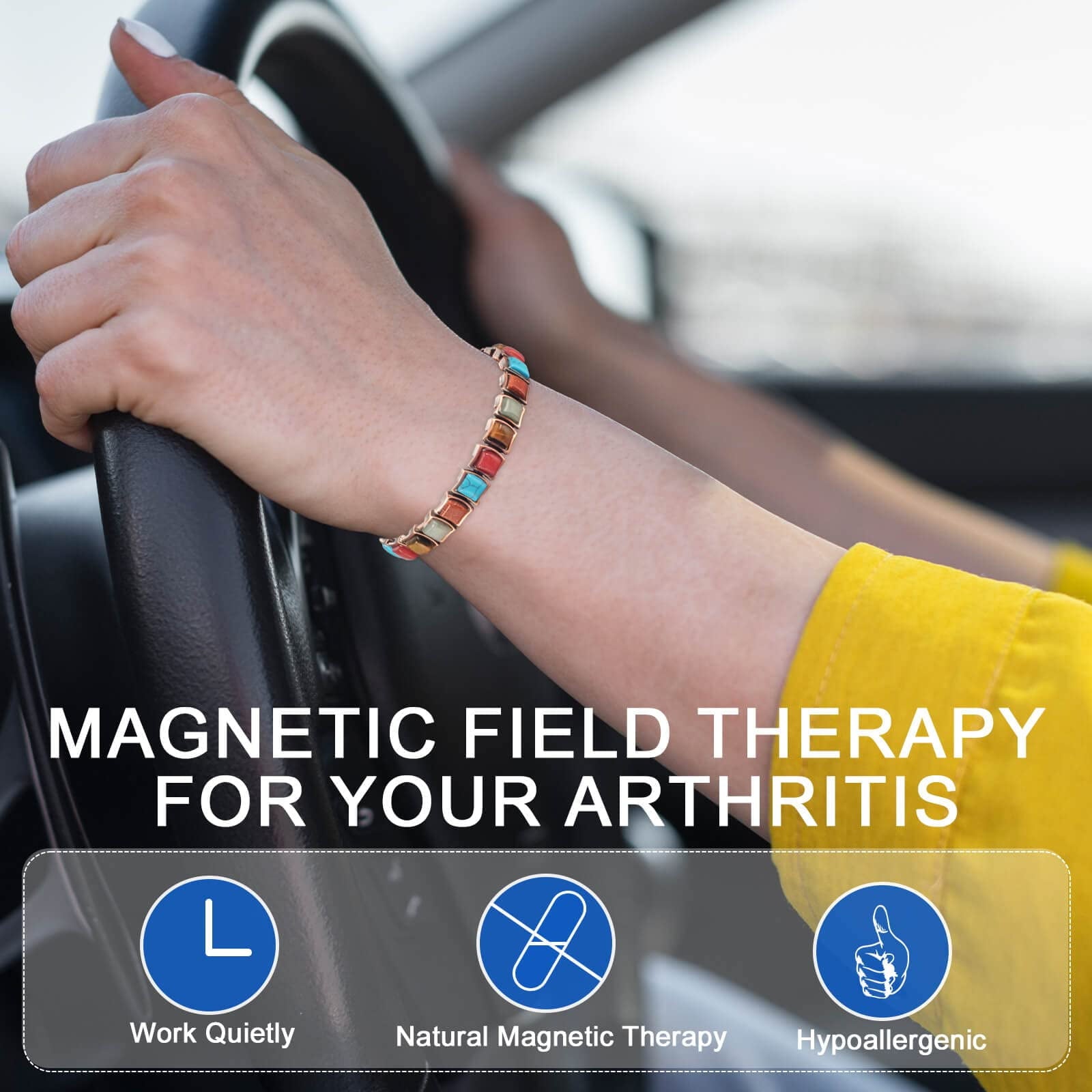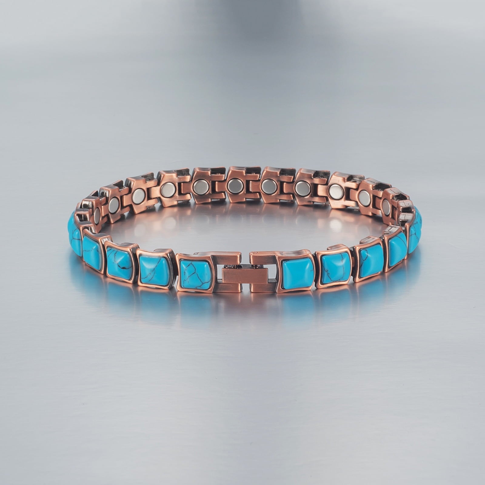 Elevate your accessory game with the Wollet Magnetic Copper Bracelet, Turquoise. This stunning bracelet features 3,500 gauss rare-earth neodymium magnets that are protected by a cover, ensuring their effectiveness remains intact over time and despite exposure to moisture. Each magnet is strategically placed to promote pain relief, reduce inflammation, and improve circulation, naturally enhancing your well-being. The bracelet's vibrant turquoise stones add a touch of elegance, making it a versatile piece that complements any outfit. Its adjustable design fits wrist sizes from 7.08 to 8.26 inches, ensuring a comfortable fit for all. Experience the calming effect of a magnetic field and elevate your health with Wollet's stylish and therapeutic bracelet.