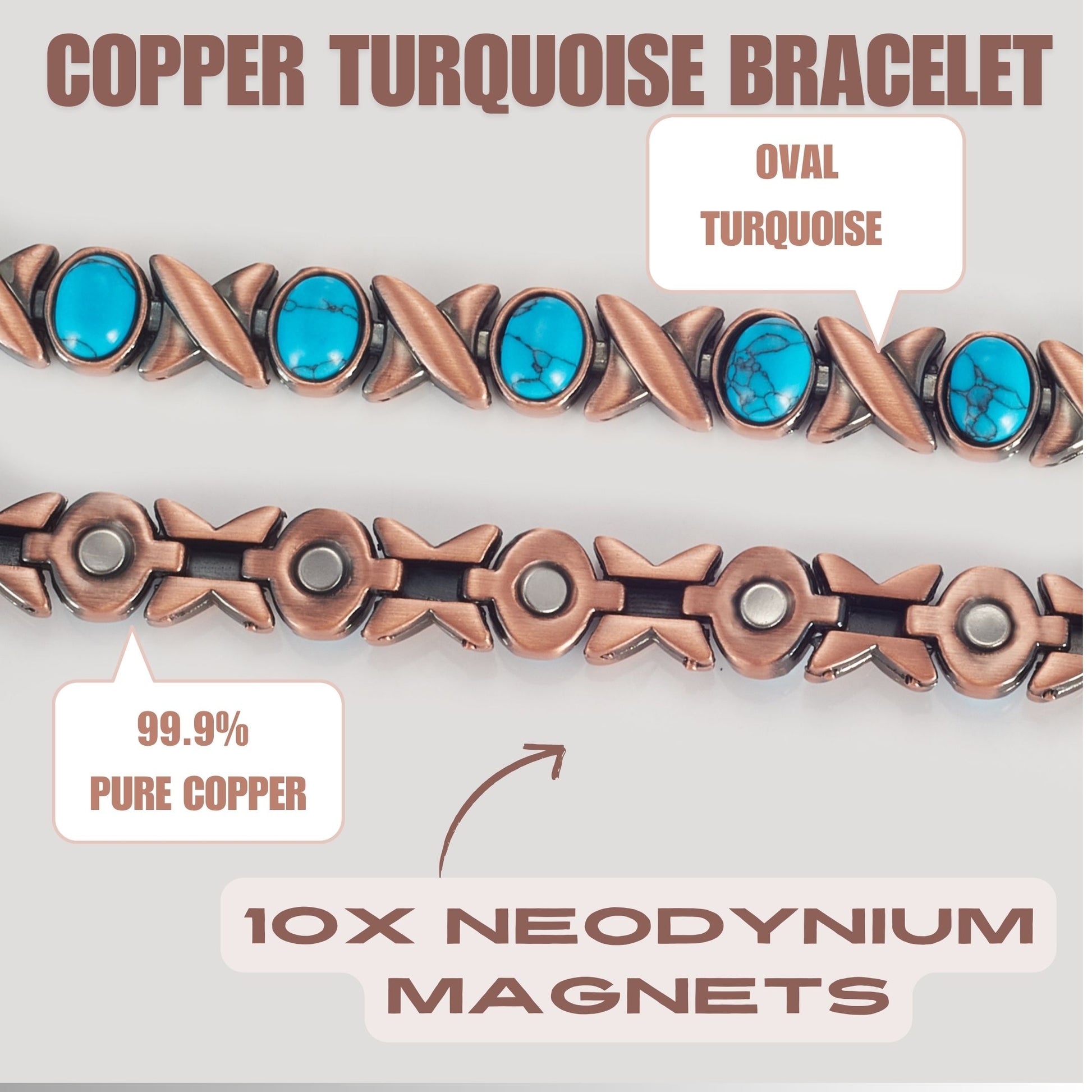 Step into the world of wellness with Wollet's Magnetic Pure Copper Bracelet for Women, featuring stunning turquoise stones that are as beneficial as they are beautiful. This bracelet is a fusion of fashion and function, equipped with over 3,500 Gauss powerful rare-earth neodymium magnets designed to promote pain relief, reduce inflammation, and enhance blood circulation. Each magnet is meticulously encased, ensuring its therapeutic properties remain intact over time and through exposure to moisture. Crafted from 99.95% pure copper, this hypoallergenic bracelet is perfect for those with sensitive skin. Its adjustable design, ranging from 7.5 inches to 8.1 inches, ensures a comfortable fit for most wrist sizes. Whether you're looking to improve your health naturally or seeking a thoughtful gift, Wollet's Magnetic Pure Copper Bracelet is an elegant choice that complements any outfit while providing subtle health benefits.