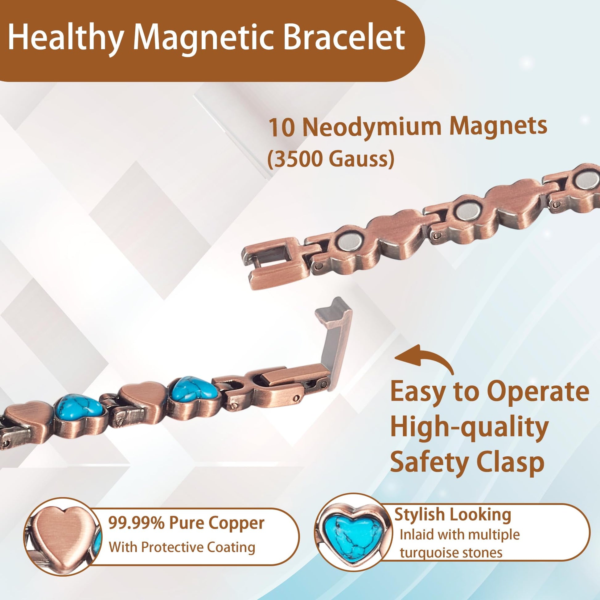 Elevate your style and well-being with Wollet's Magnetic Pure Copper Bracelet for Women, featuring stunning turquoise stones. This bracelet is not just a fashion statement; it's a commitment to health. Equipped with over 3,500 Gauss powerful rare-earth neodymium magnets, it's designed to help reduce inflammation, improve circulation, and promote pain relief. Each magnet is protected by a cover, ensuring its effectiveness is maintained over time and through exposure to moisture. Crafted from 99.95% pure copper, this hypoallergenic bracelet is perfect for those with sensitive skin. Its adjustable design fits wrist sizes from 7.5 to 8.1 inches, making it a versatile accessory for any outfit. Whether you're seeking to enhance your health naturally or looking for a thoughtful gift, Wollet's Magnetic Pure Copper Bracelet is an elegant choice that combines therapeutic benefits with a chic look.